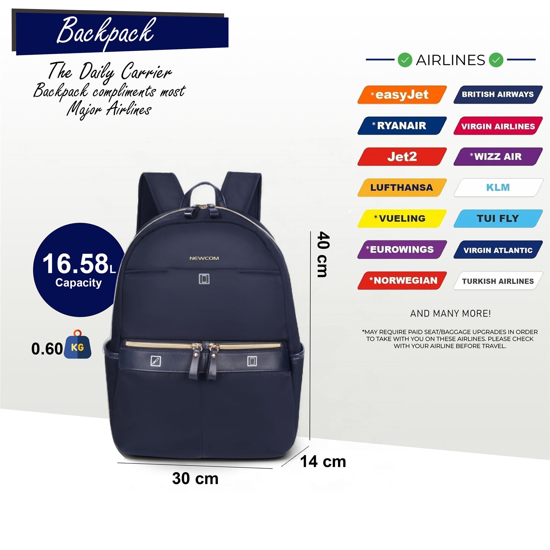 Backpack Rucksack 40 x 30 x 14 cm Blue Underseat Travel Cabin Bag for Ryanair, Easy Jet