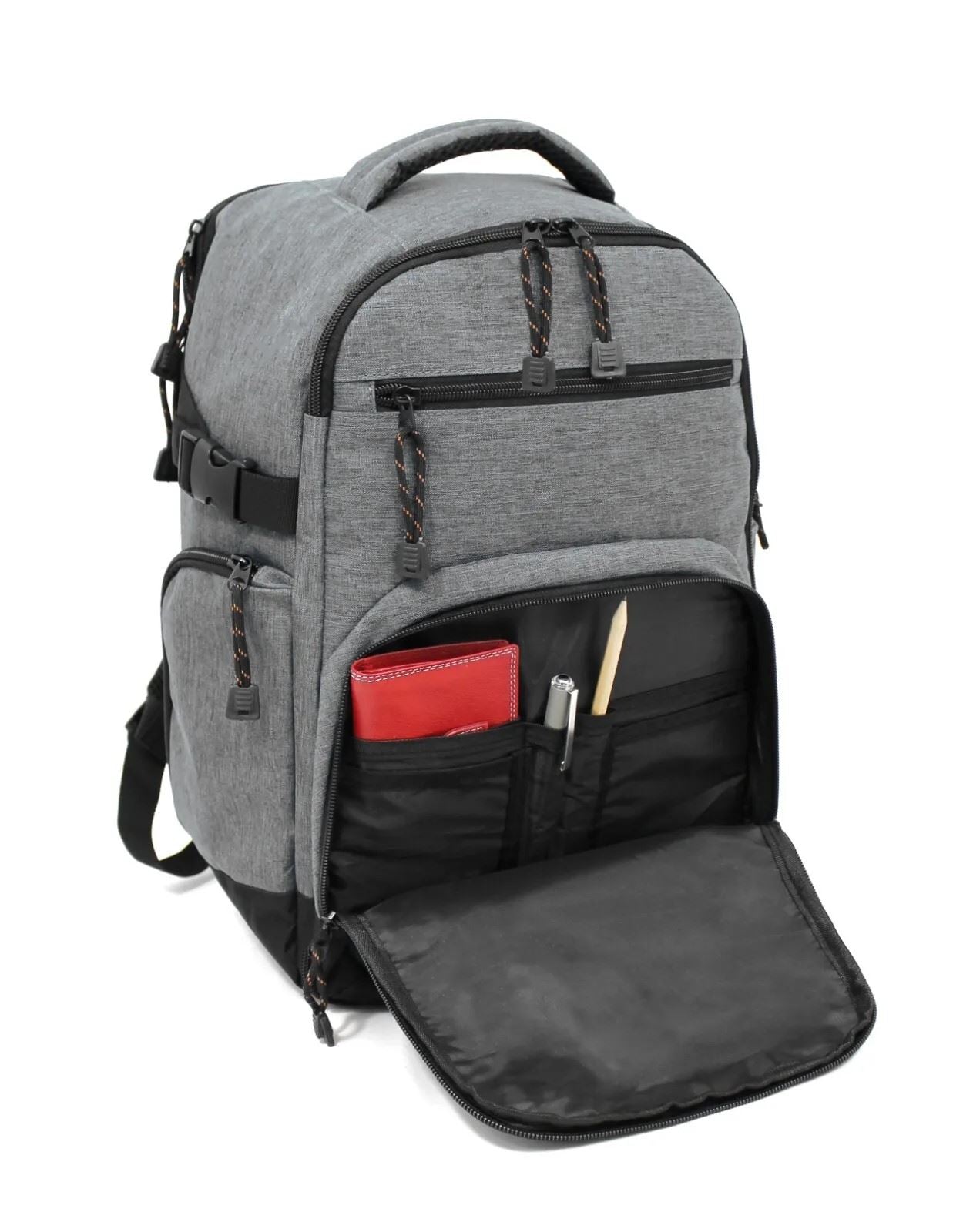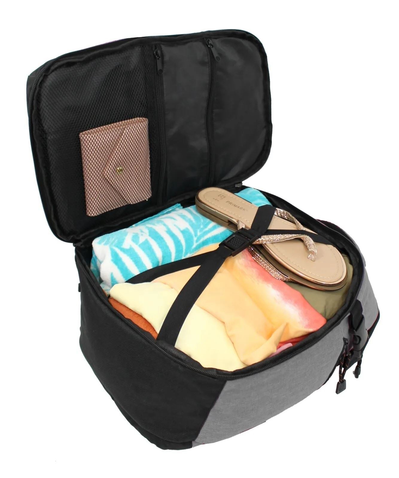 The roomy main compartment opens like a suitcase and includes interior elastic straps to keep your items secure. Twin interior zipper pockets help organize smaller belongings, and a built-in top handle adds to the ease of travel, making this backpack an ideal companion.